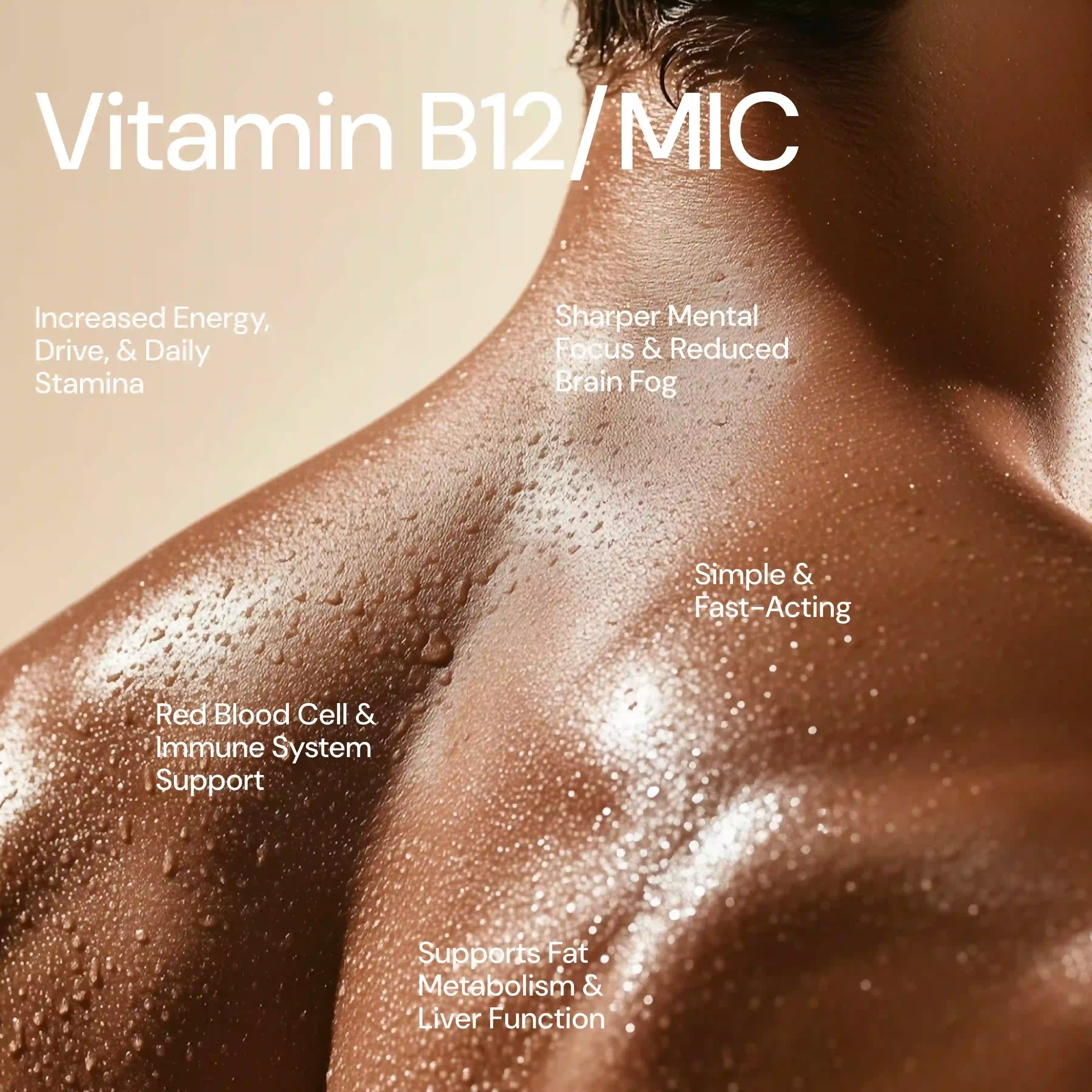 Vitamin B12 (cyanocobalamin or methylcobalamin, depending on formulation) — supports normal red blood cell formation and energy metabolism. MIC blend — typically a combination of nutrients used in metabolic support protocols (formulation may vary by pharmacy and plan).